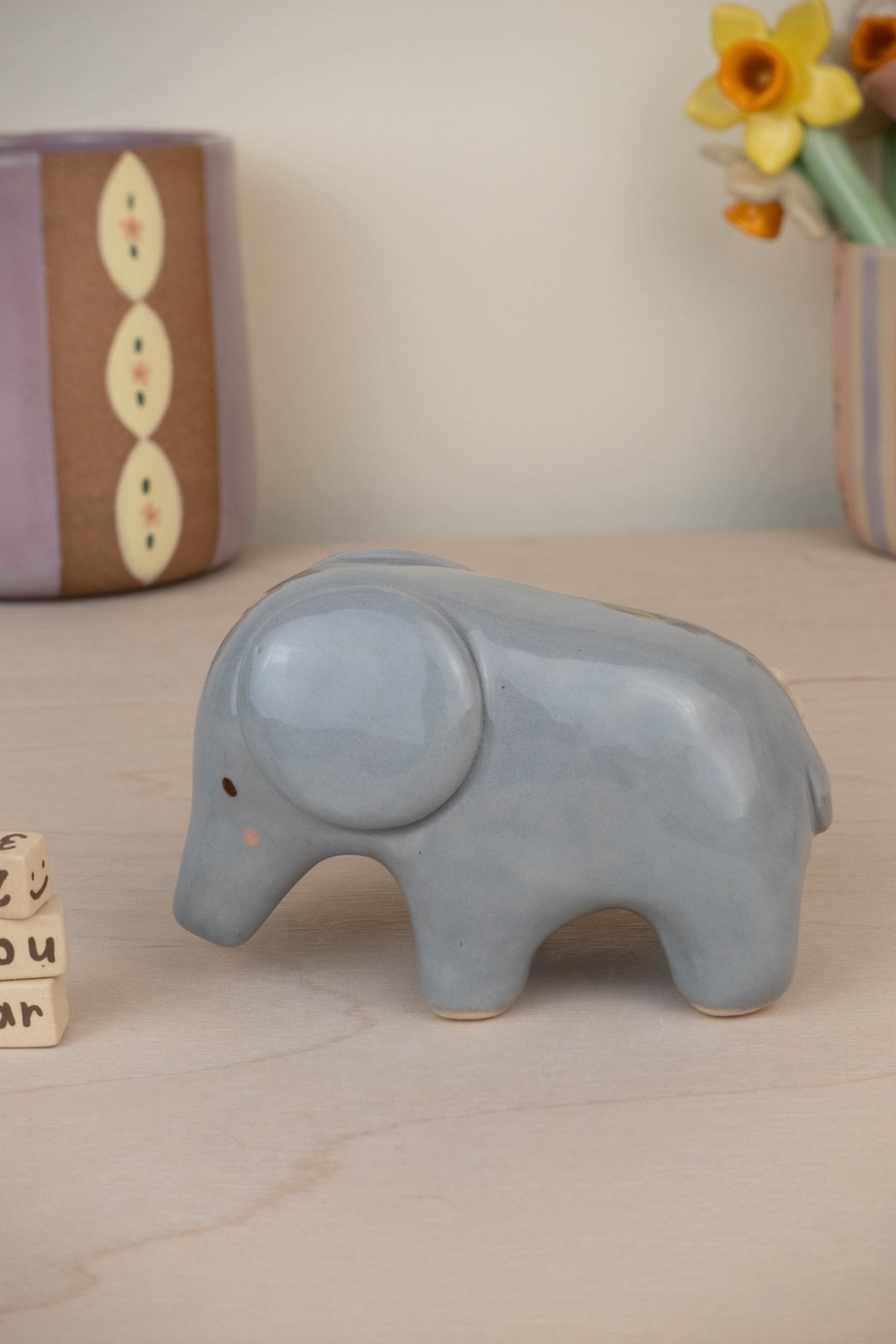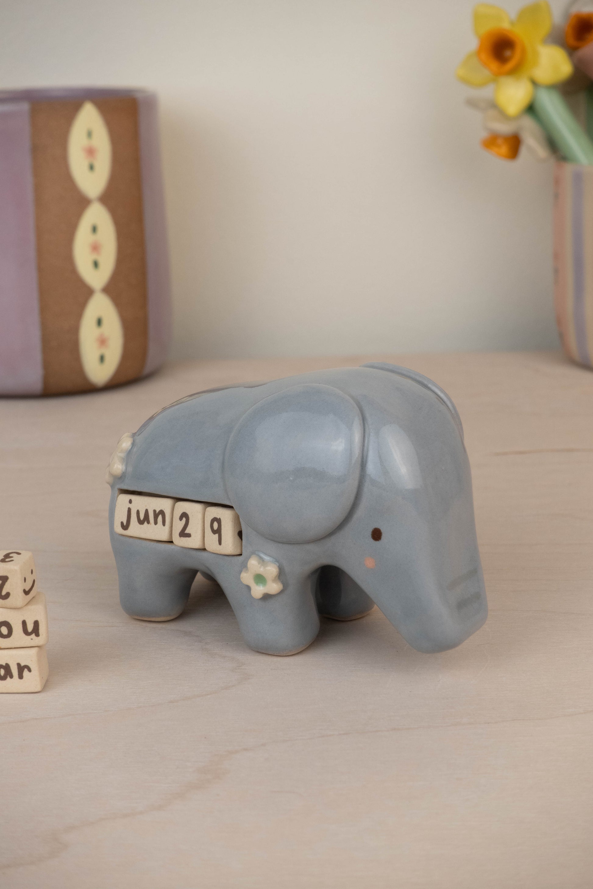 This listing is for 1 elephant calendar which includes: the elephant itself, 3 number blocks, 3 month rectangular blocks. All pieces are made of stoneware ceramic and glazed with various colours!