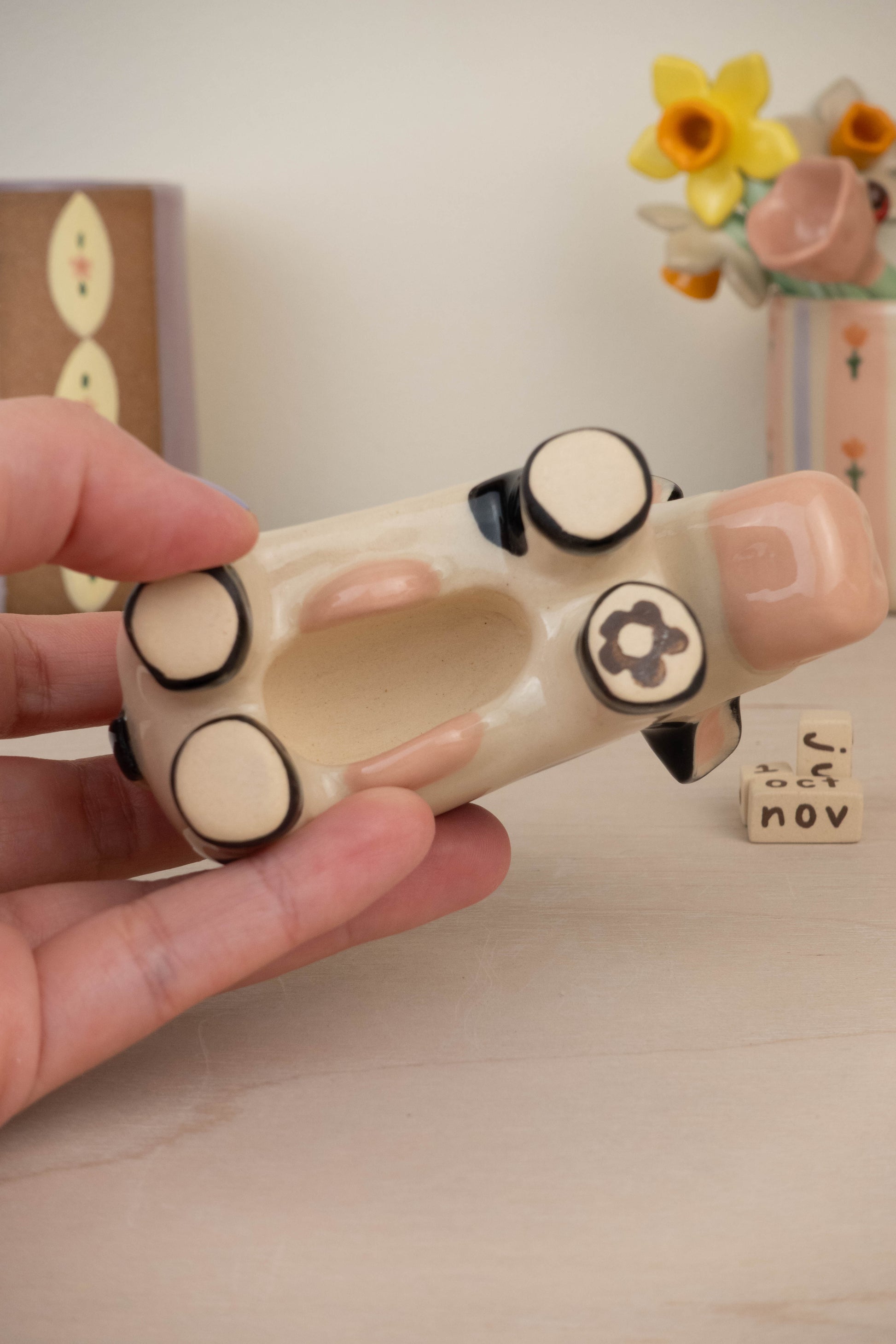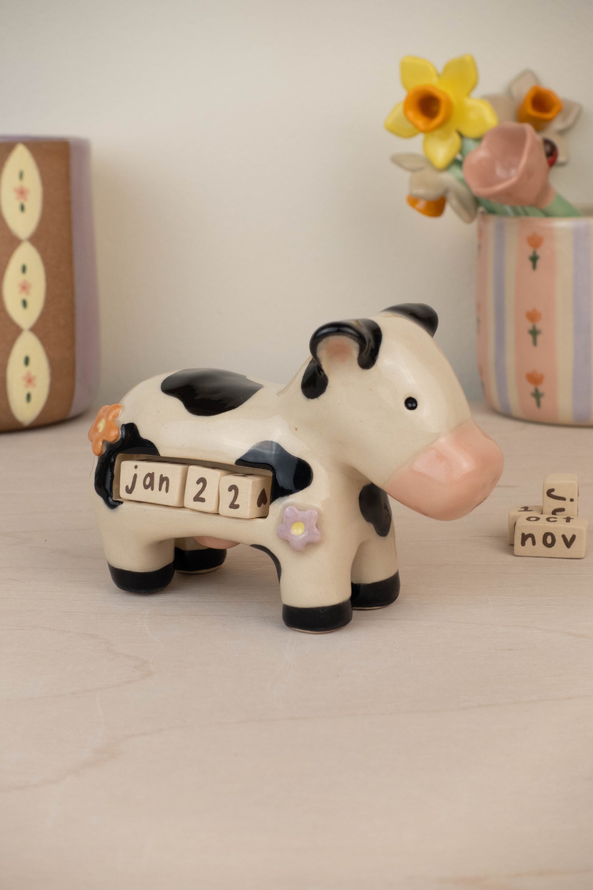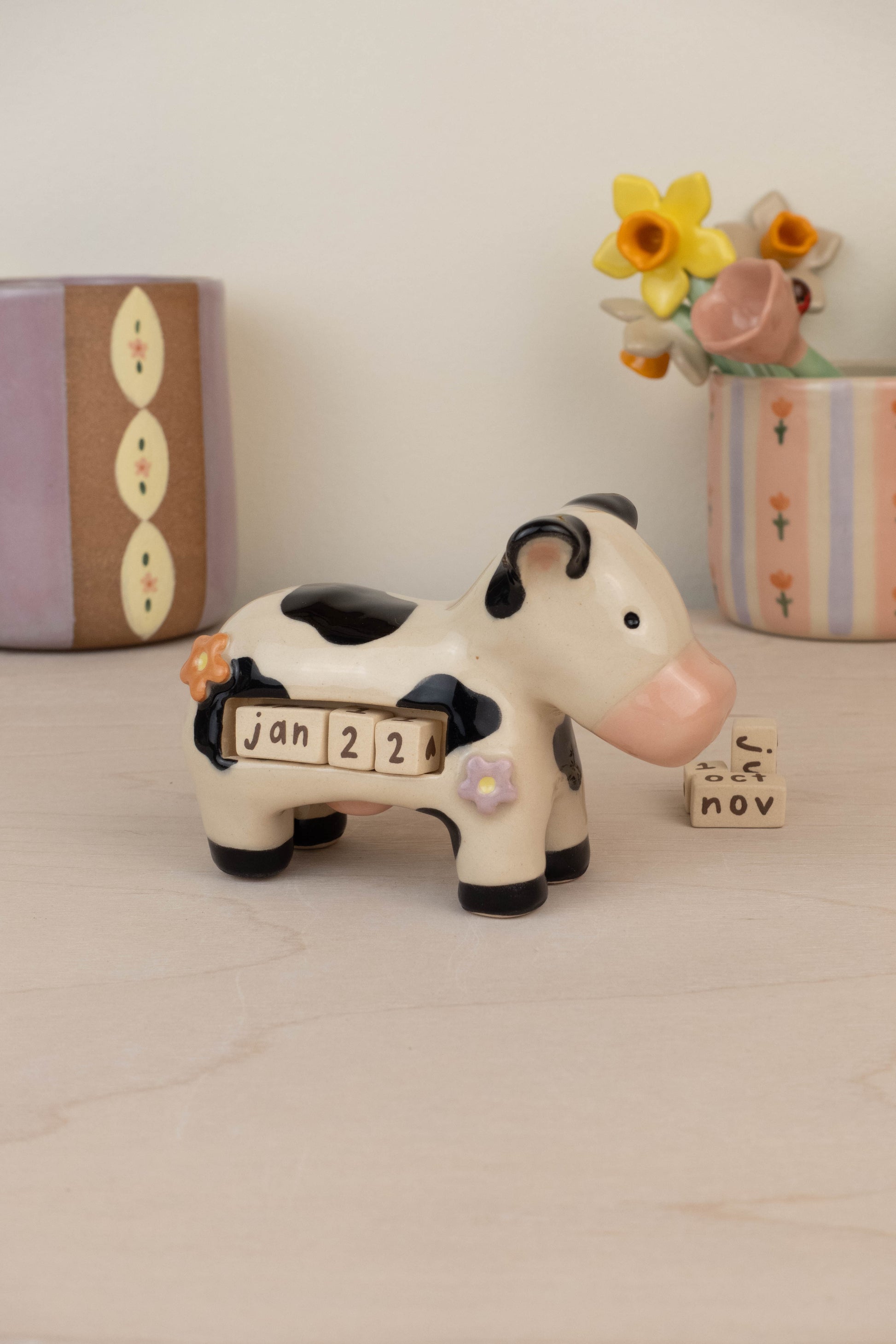 This listing is for 1 cow calendar which includes: the cow itself, 3 number blocks, 3 month rectangular blocks. All pieces are made of stoneware ceramic and glazed with various colours!
