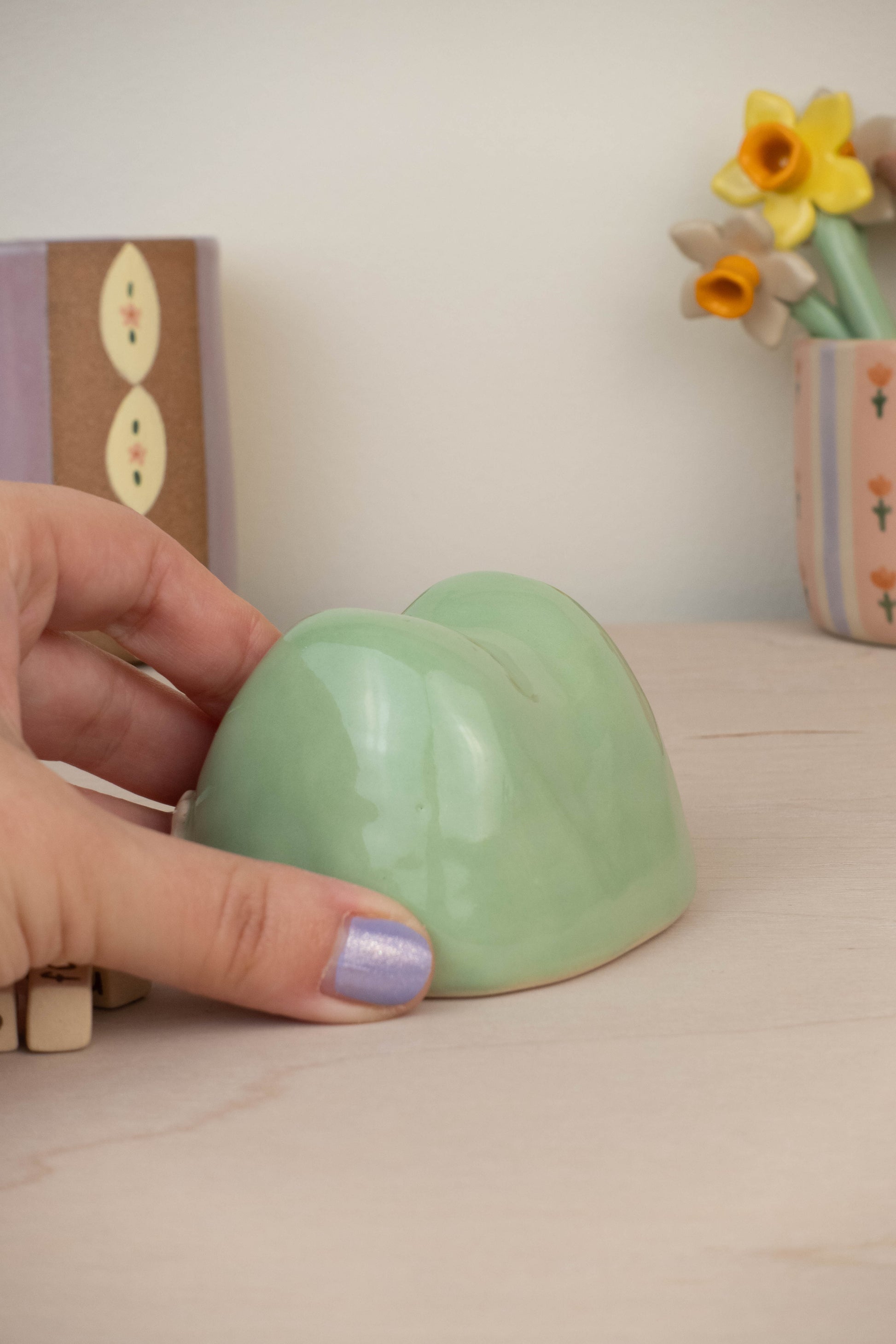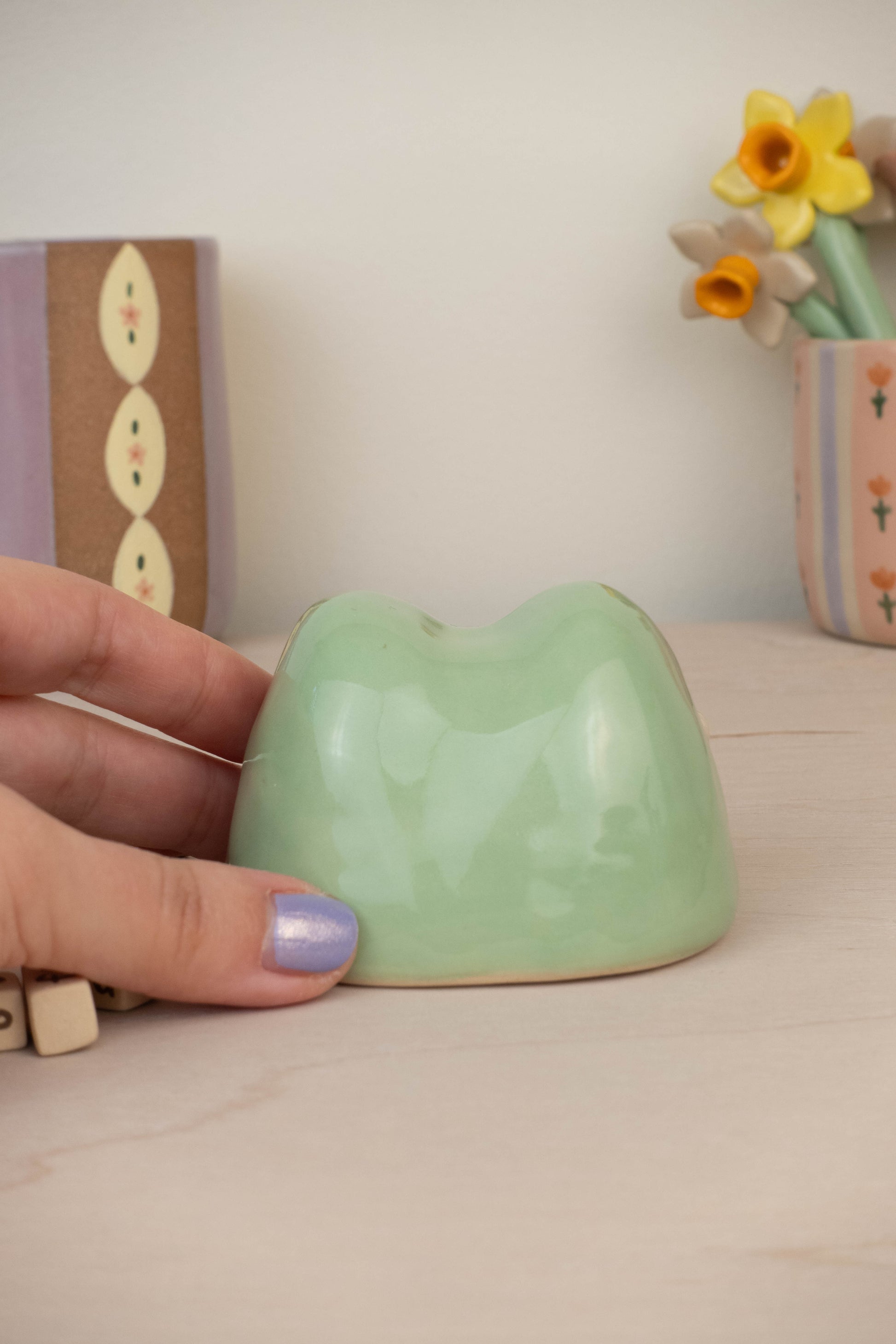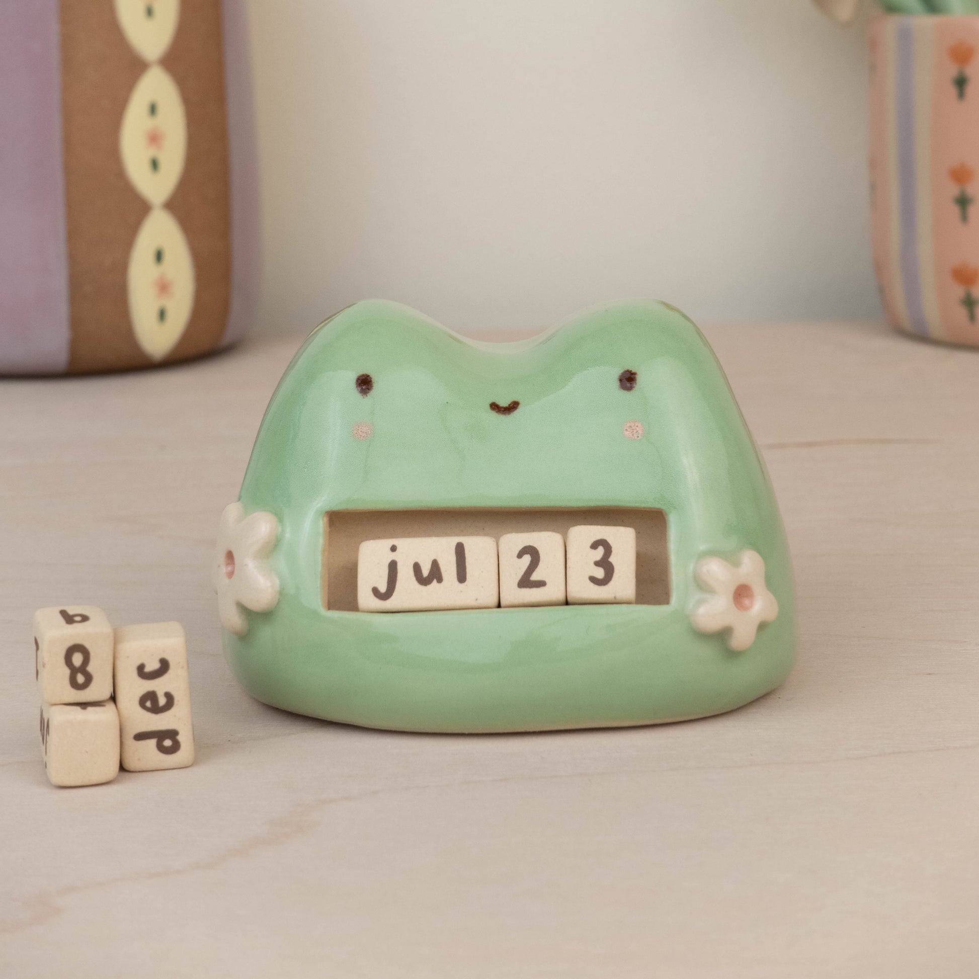 This listing is for 1 frog calendar which includes: the frog itself, 3 number blocks, 3 month rectangular blocks. All pieces are made of stoneware ceramic and glazed with various colours!