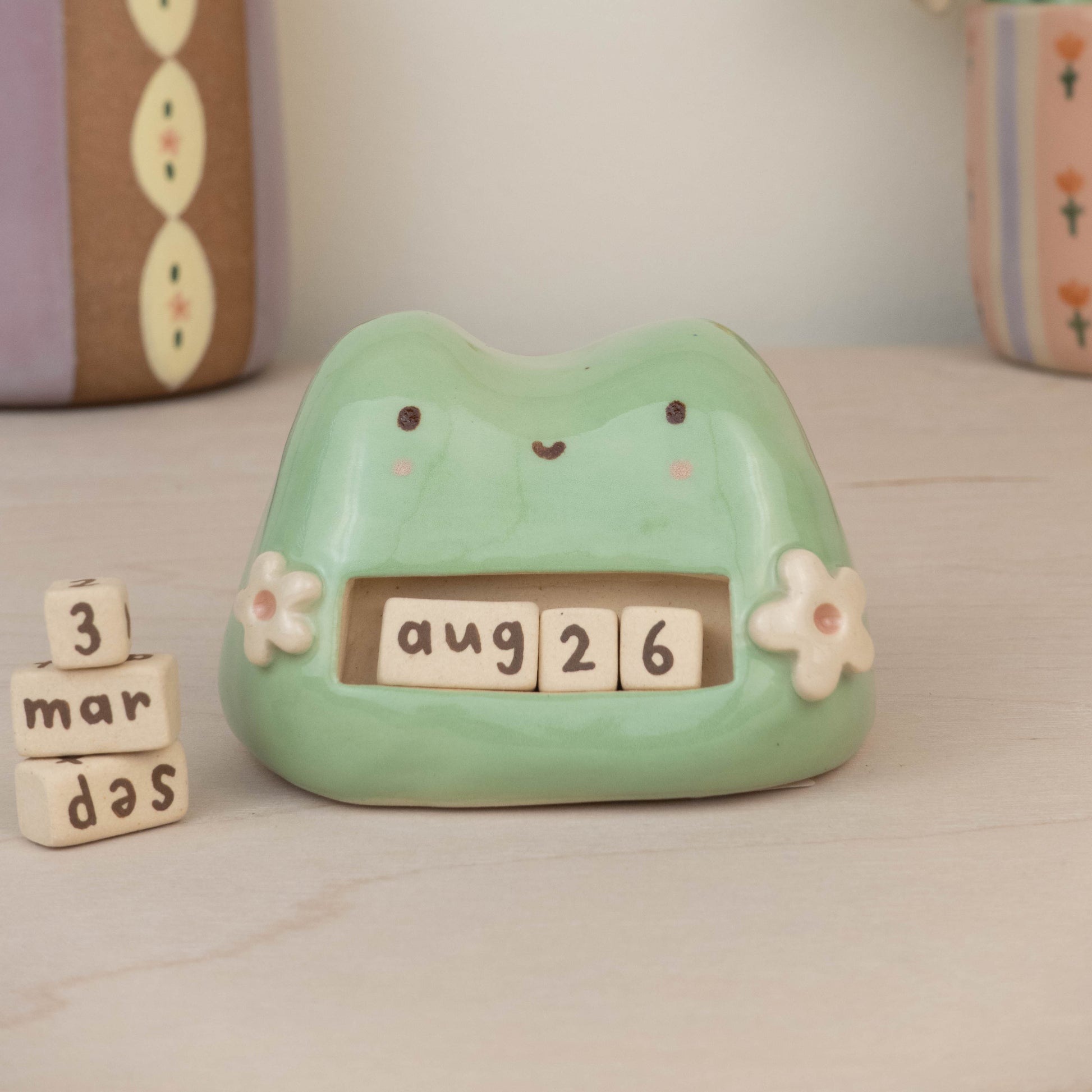 This listing is for 1 frog calendar which includes: the frog itself, 3 number blocks, 3 month rectangular blocks. All pieces are made of stoneware ceramic and glazed with various colours!