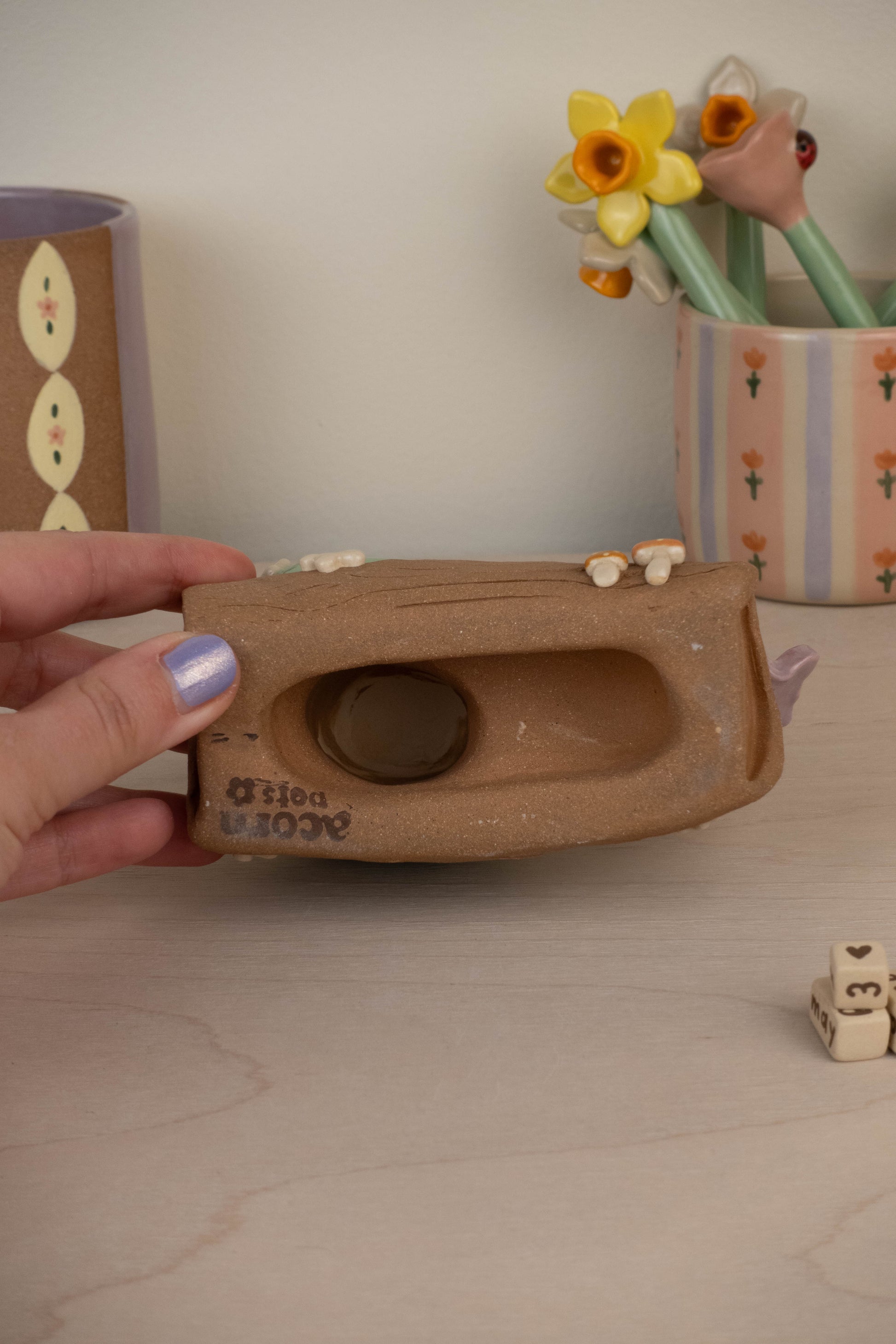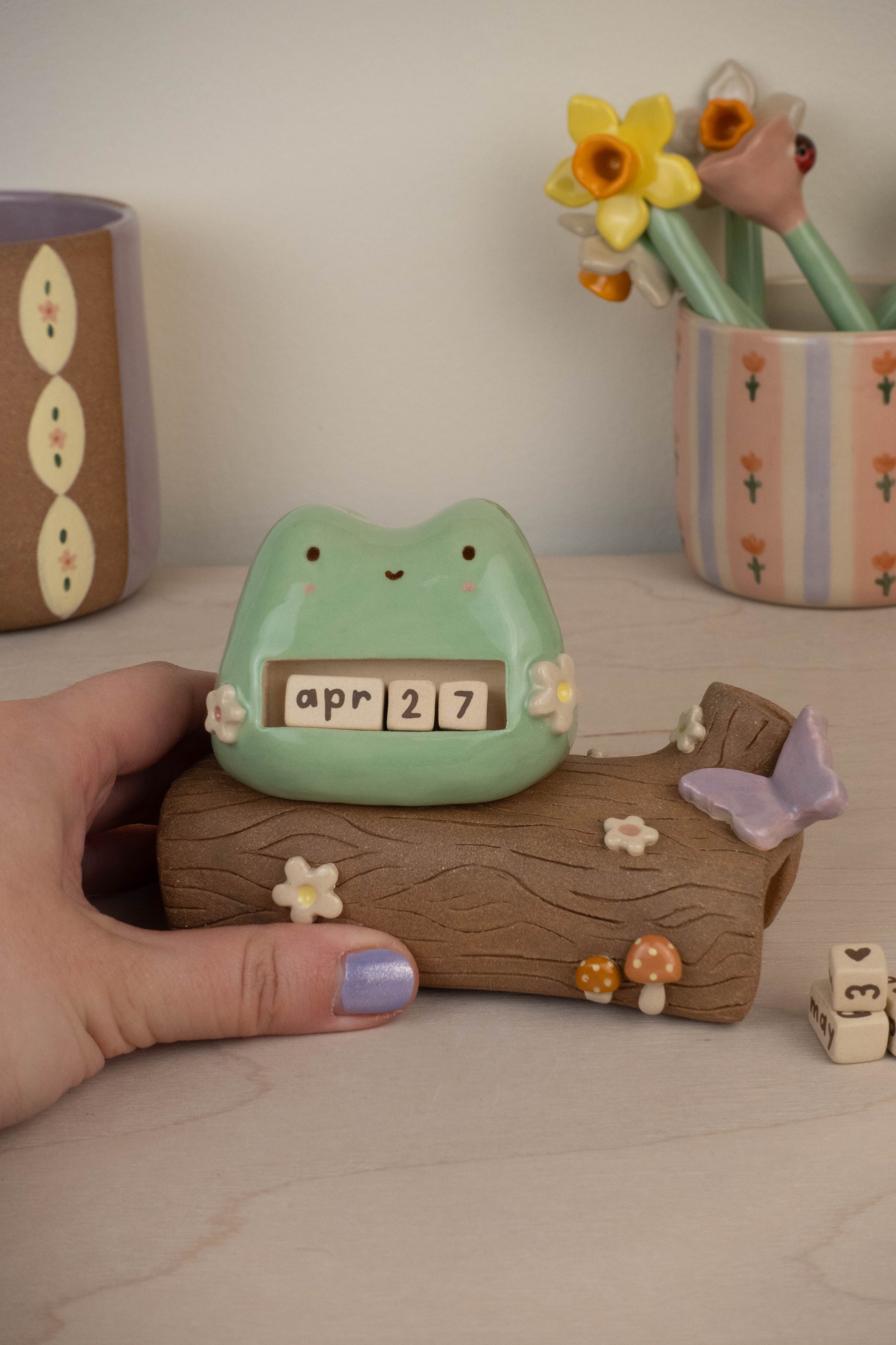 This listing is for 1 frog on a log calendar which includes: the calendar itself, 3 number blocks, 3 month rectangular blocks. All pieces are made of stoneware ceramic and glazed with various colours!