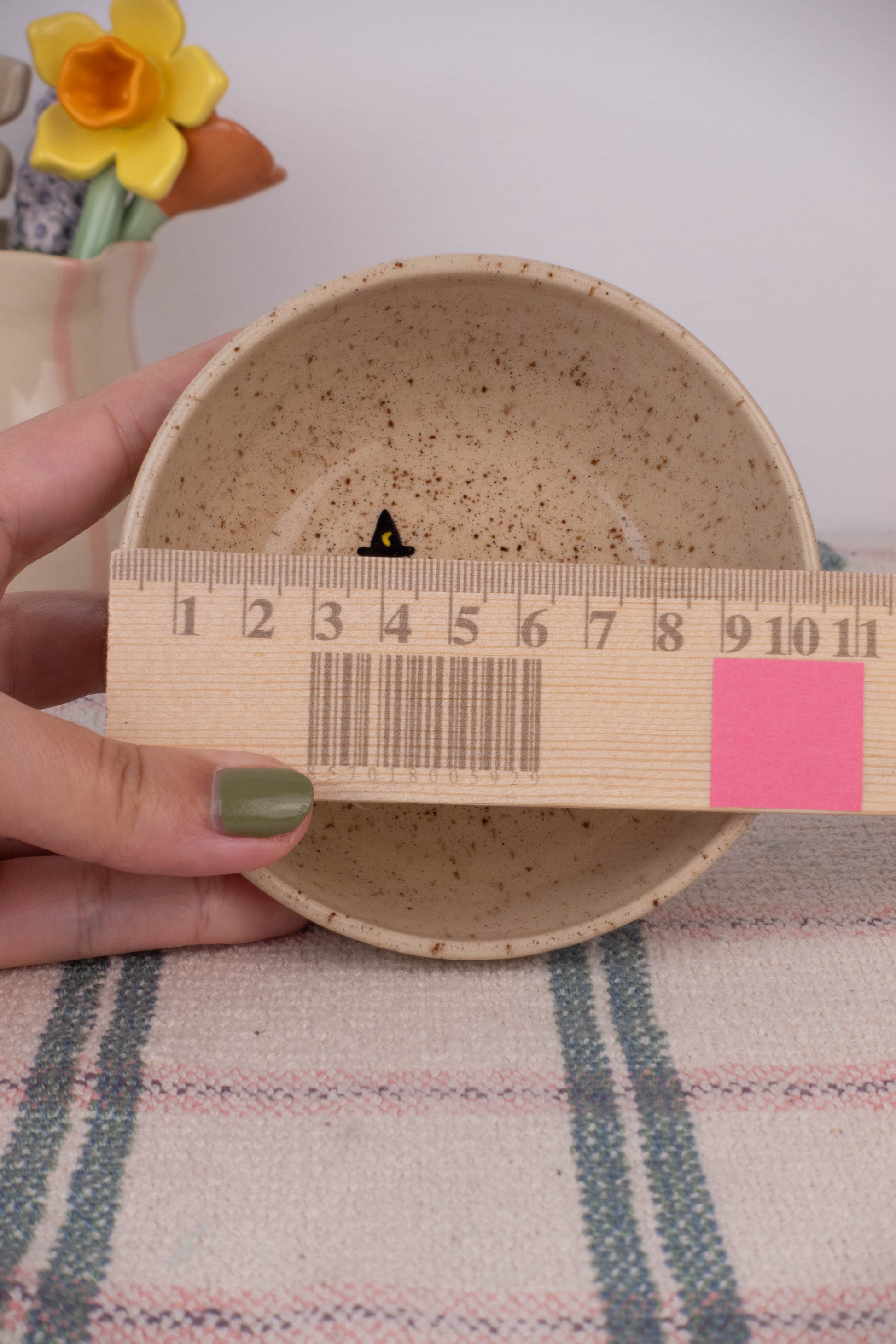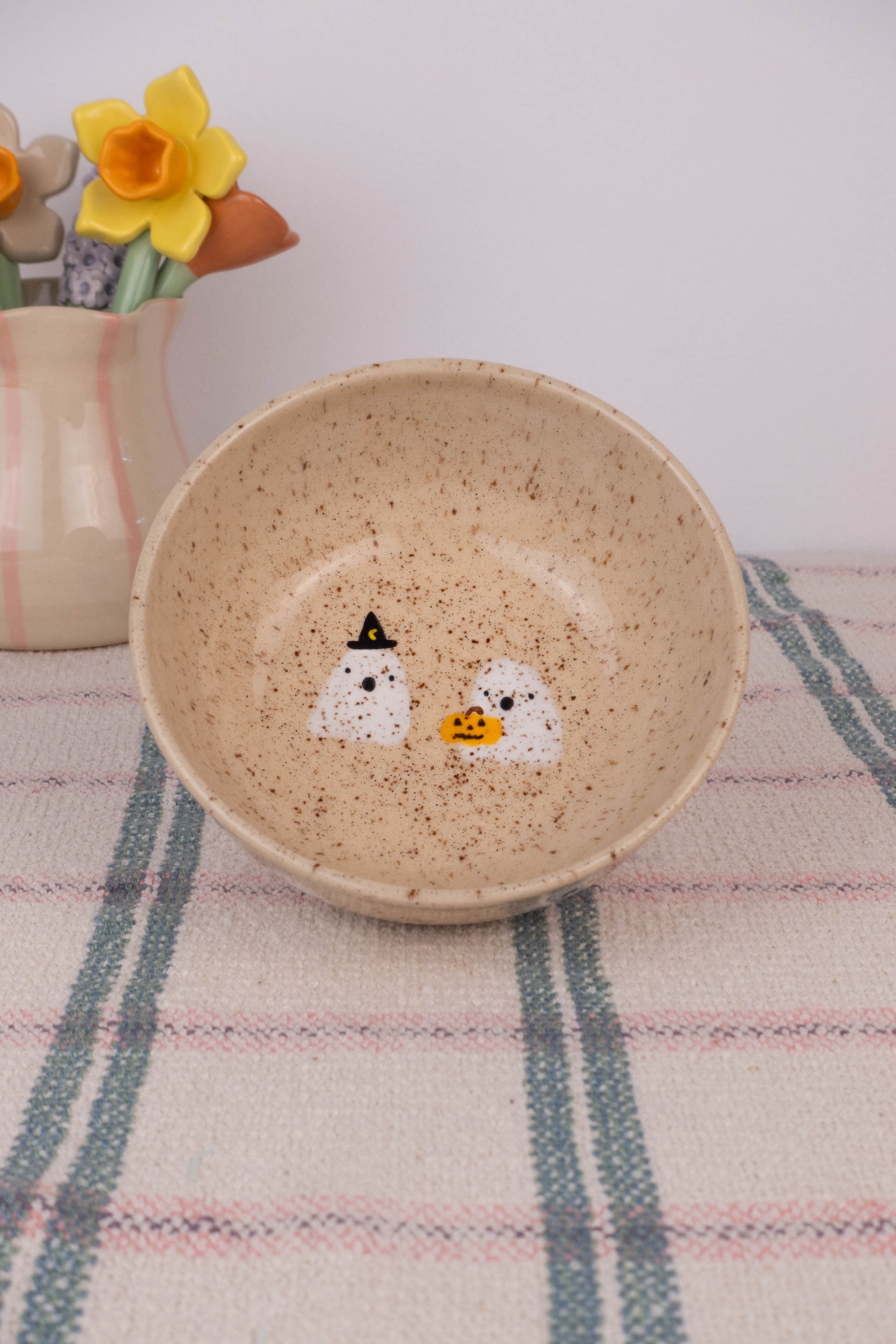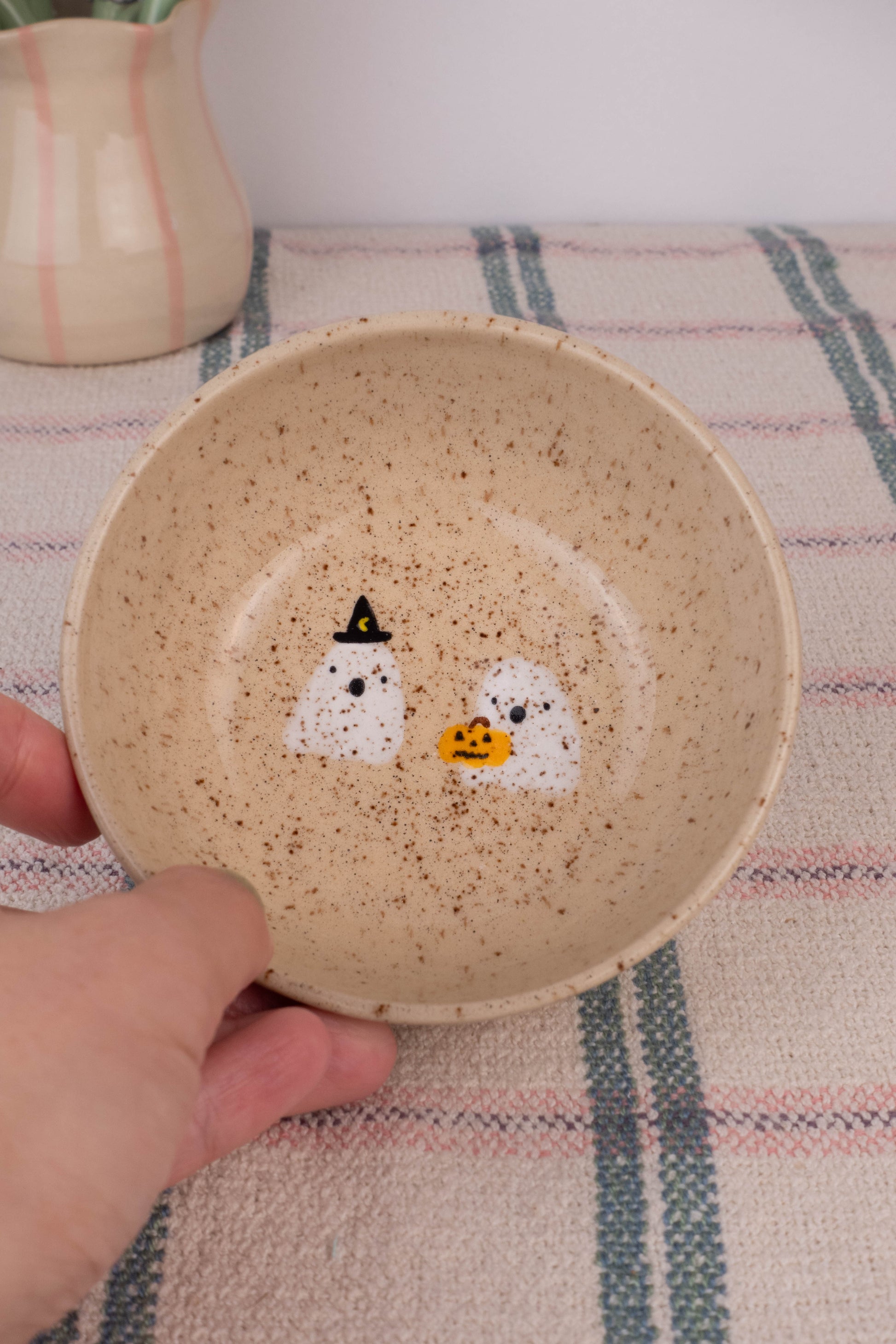 This listing is for a speckled stoneware ceramic bowl with little ghosts trick-or-treating on it!
