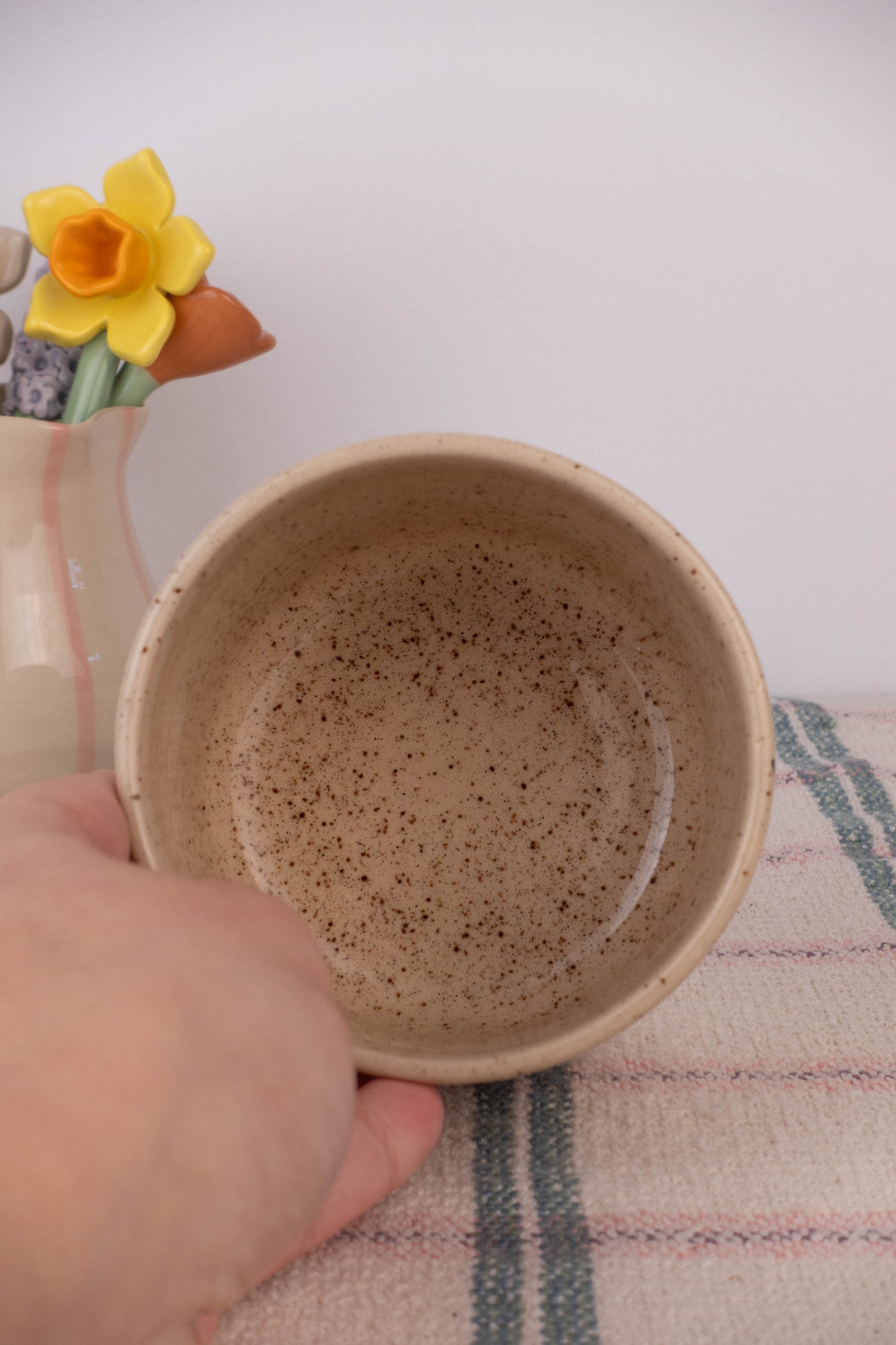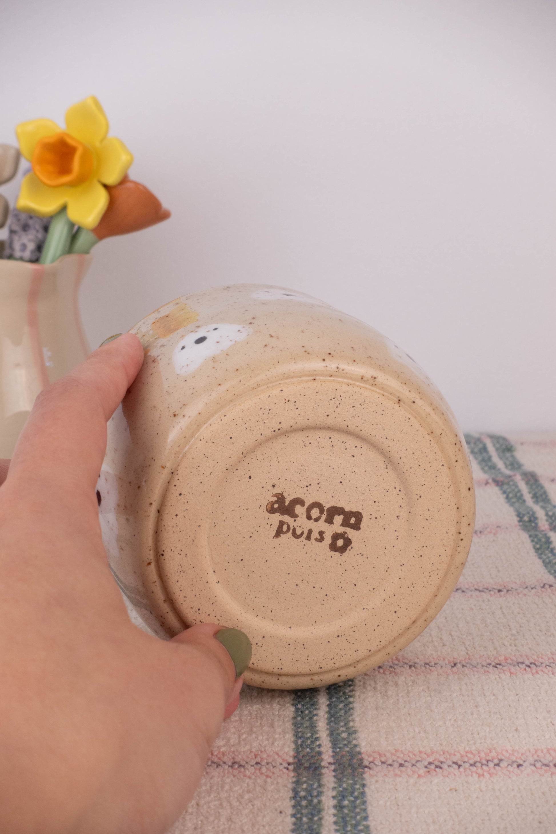 This listing is for a speckled stoneware ceramic cup with little ghosts trick-or-treating on it!
