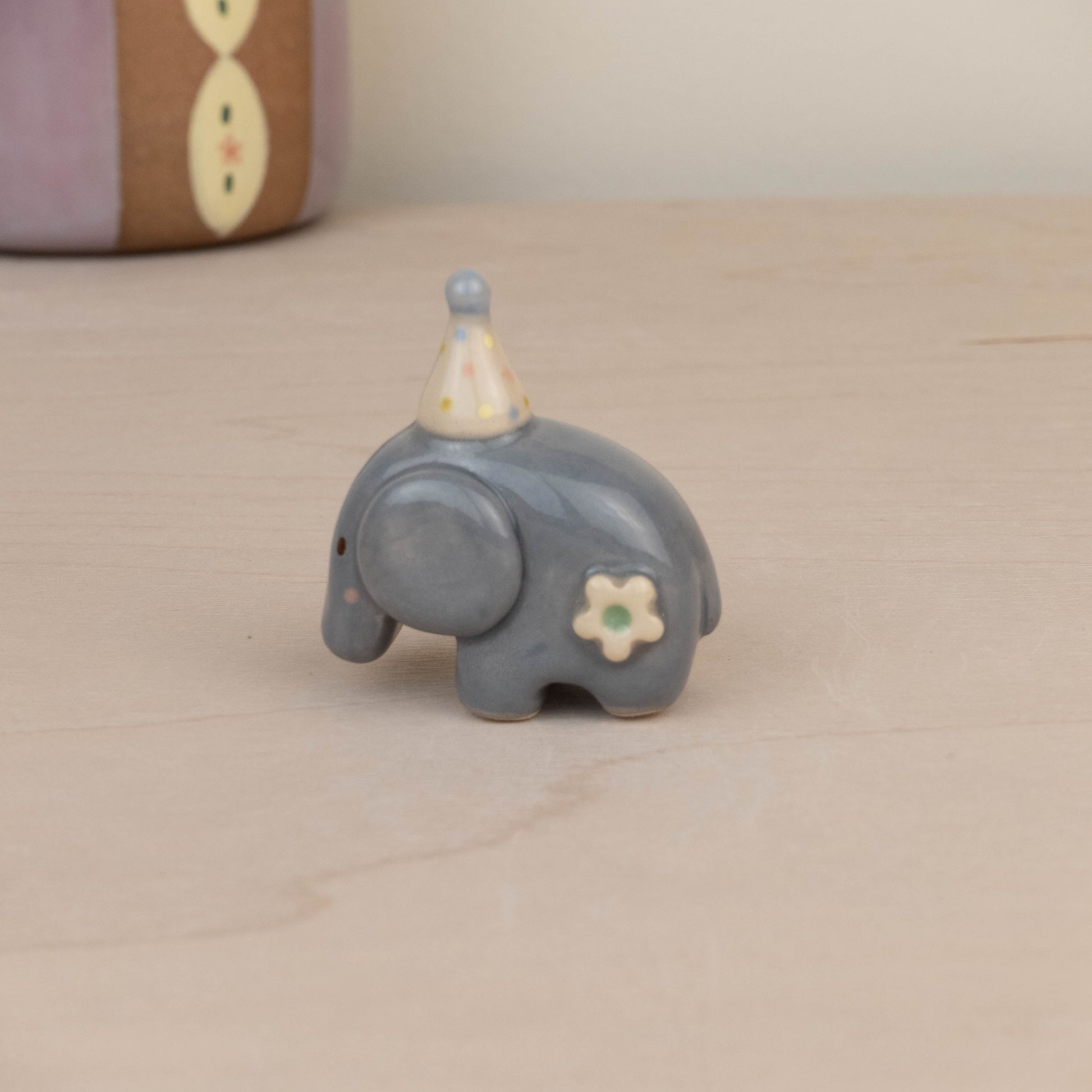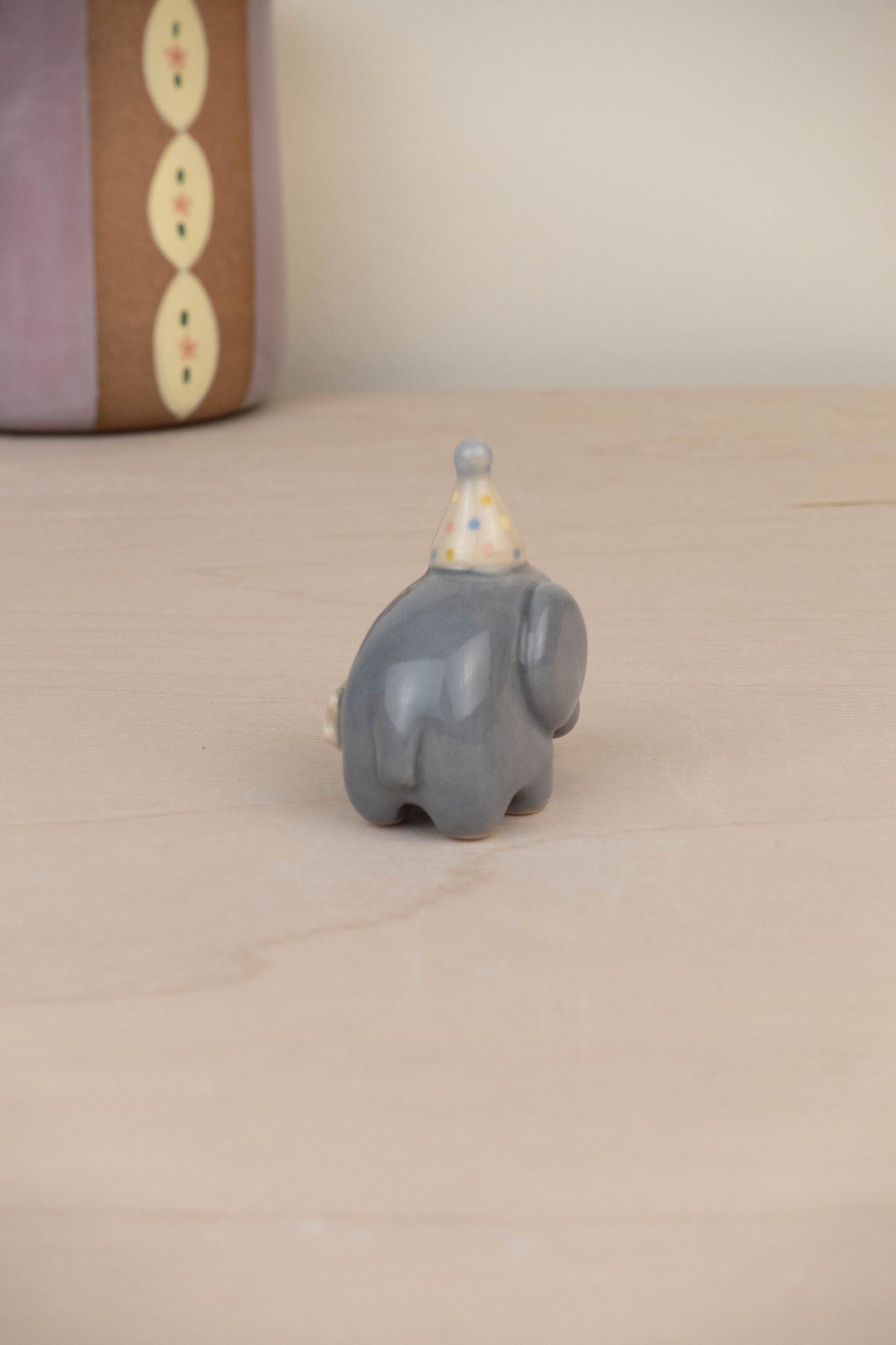 A cute elephant! it is made of ceramic stoneware and glazed with various colours.