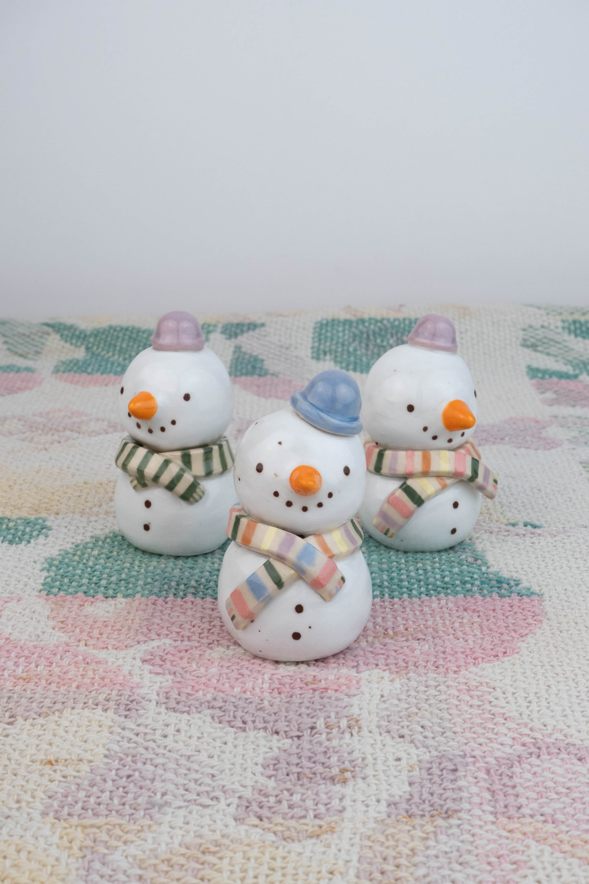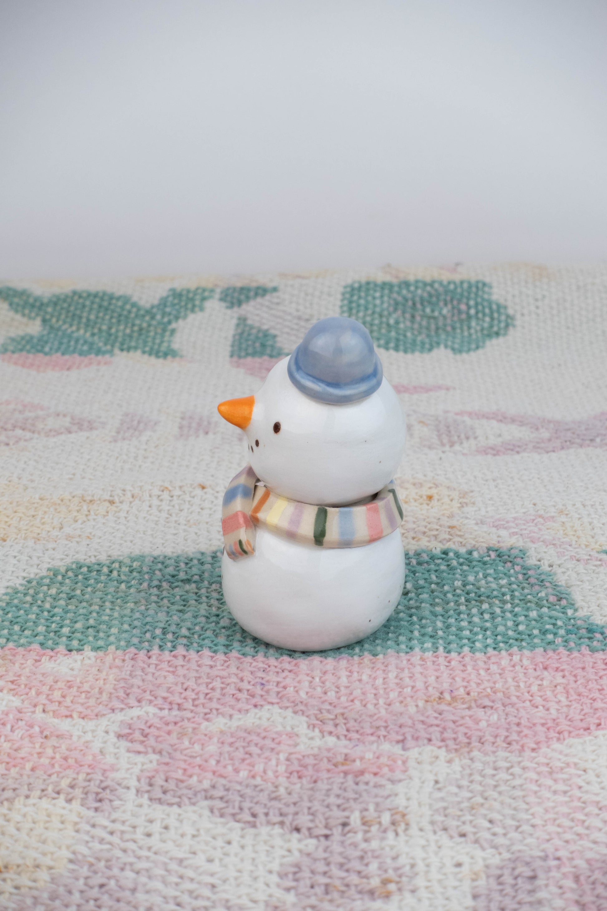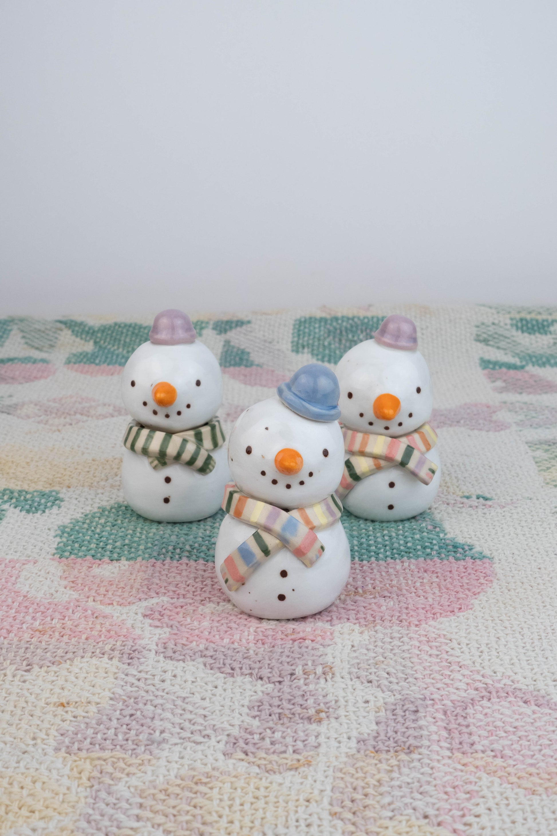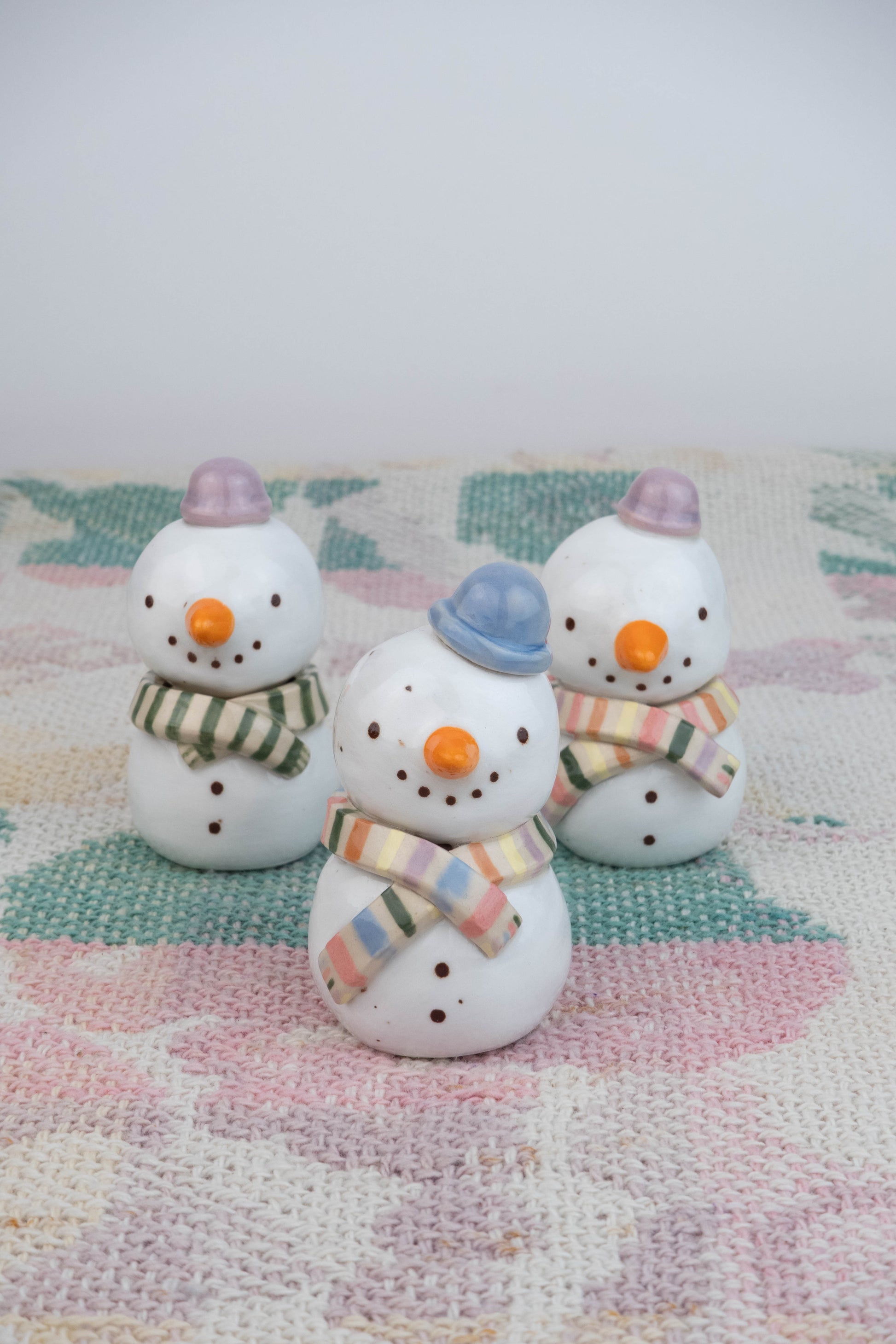 This listing is for one snowman! Choose between green and colourful scarf! they are both made of a speckled ceramic and glazed white plus various colours. Hat is attached (not removable).