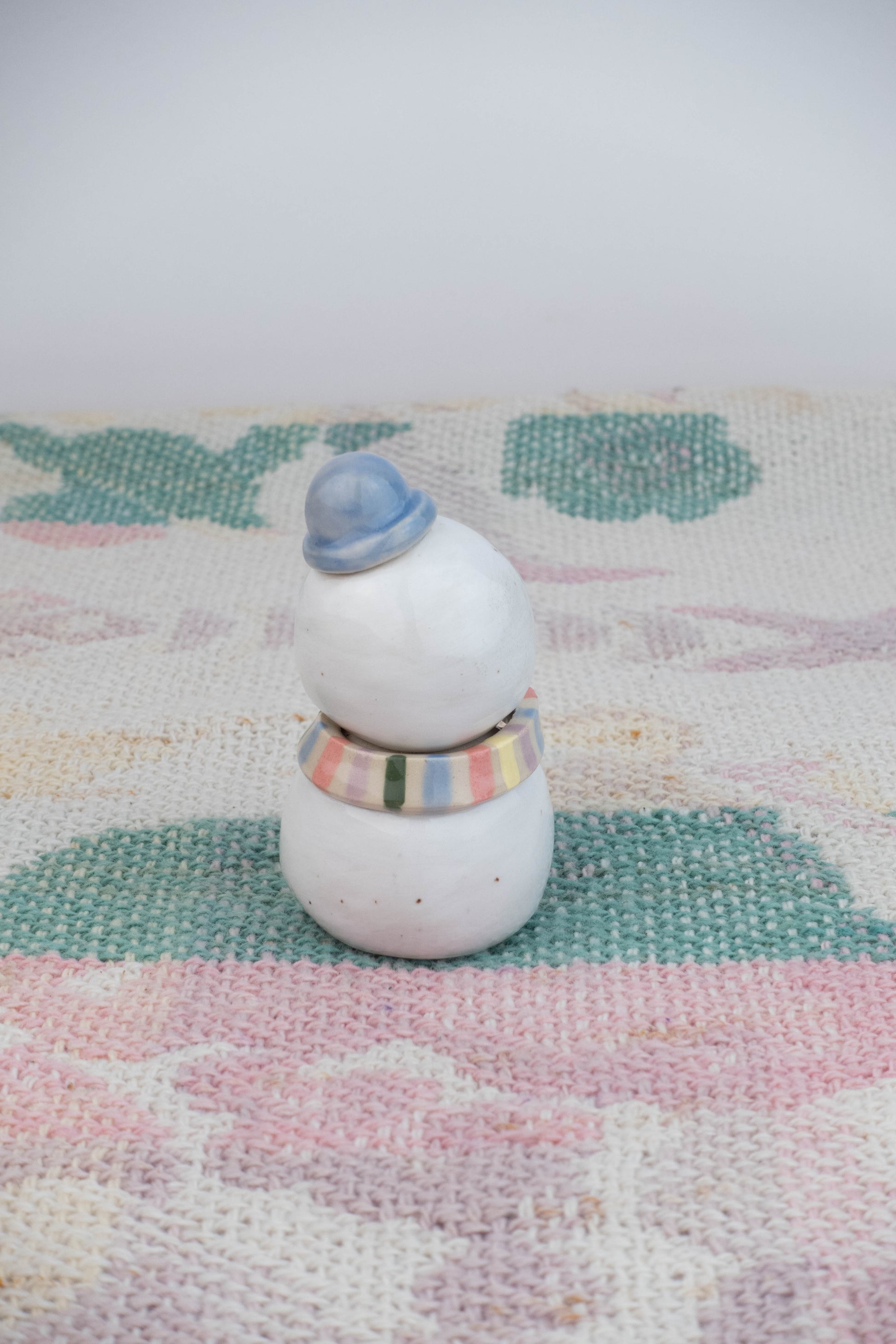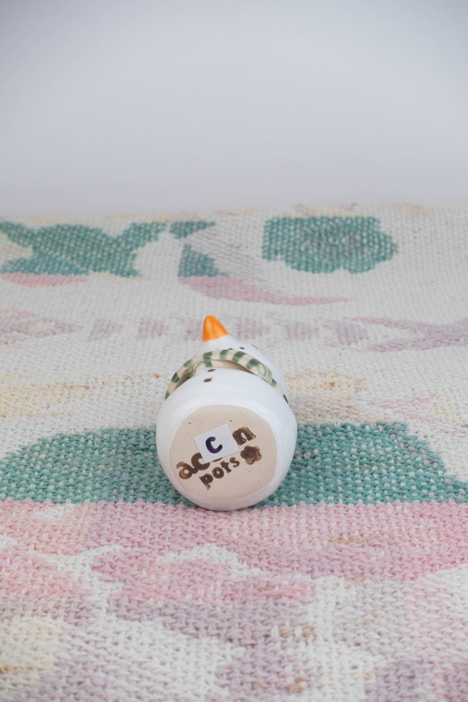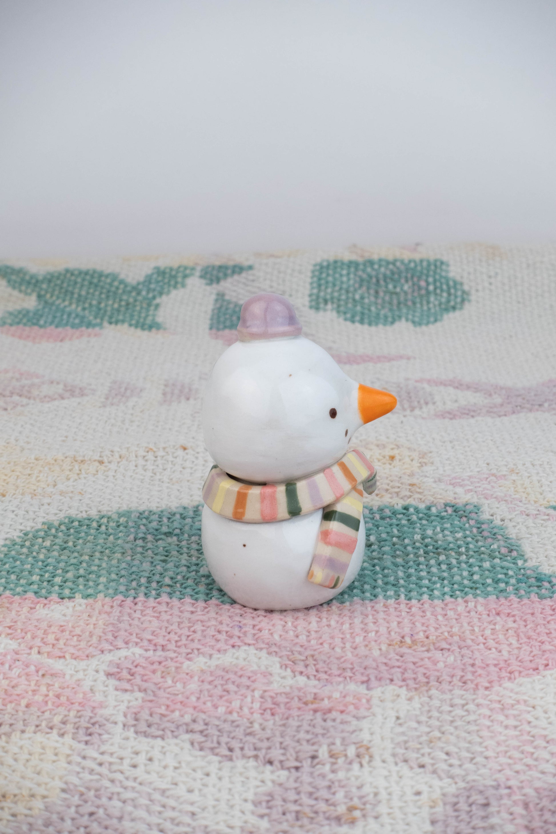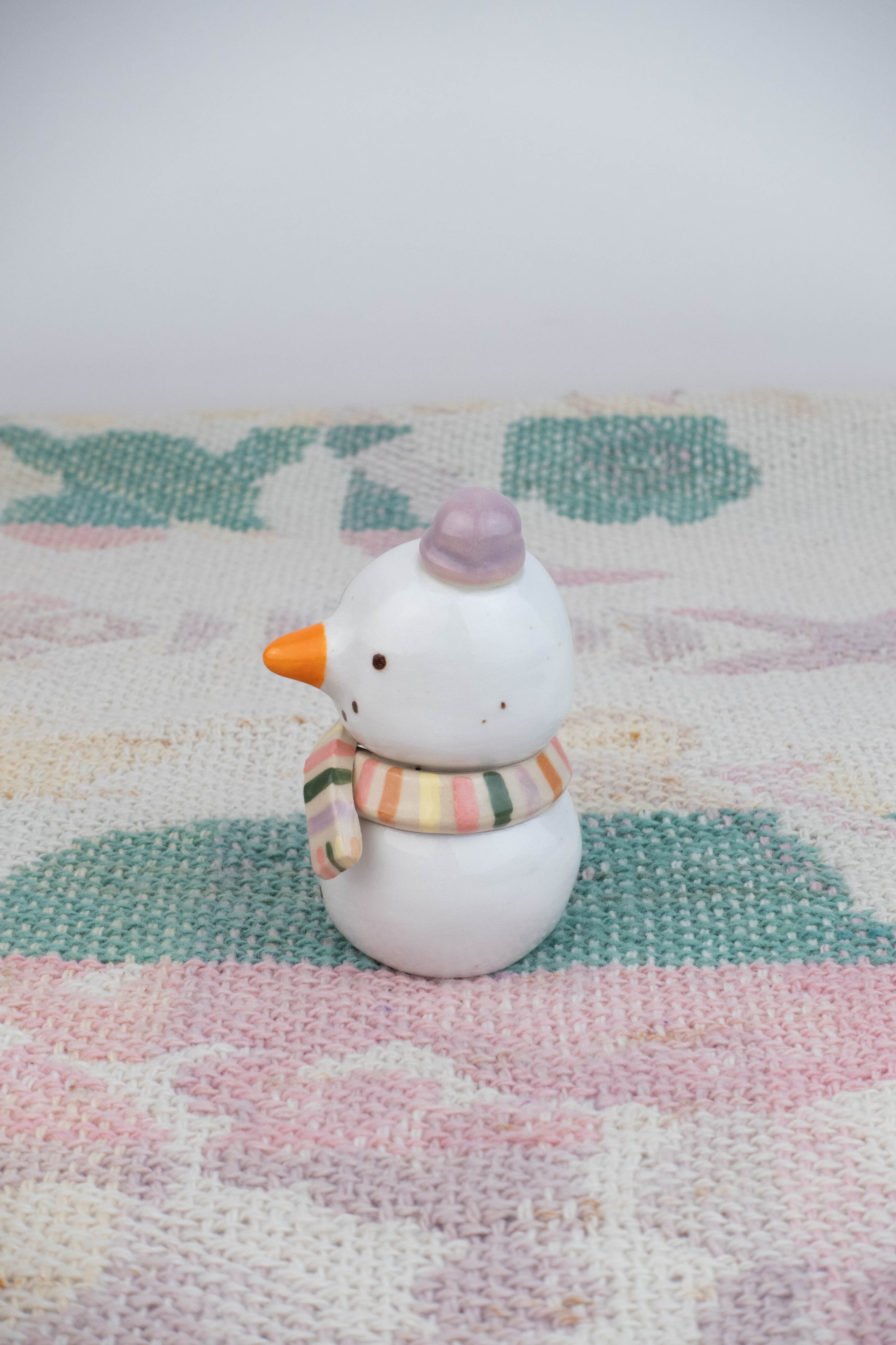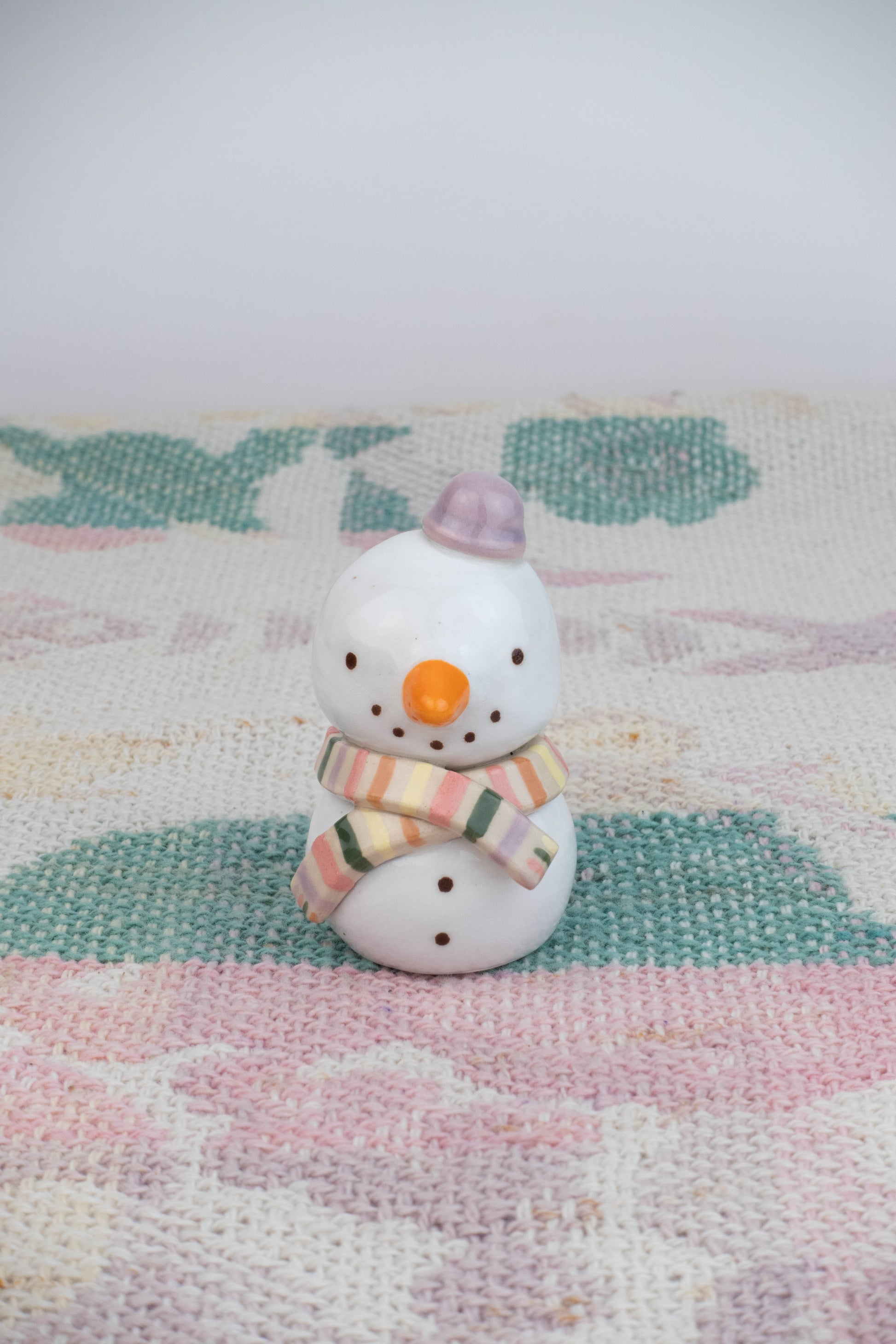 This listing is for one snowman! Choose between green and colourful scarf! they are both made of a speckled ceramic and glazed white plus various colours. Hat is attached (not removable).