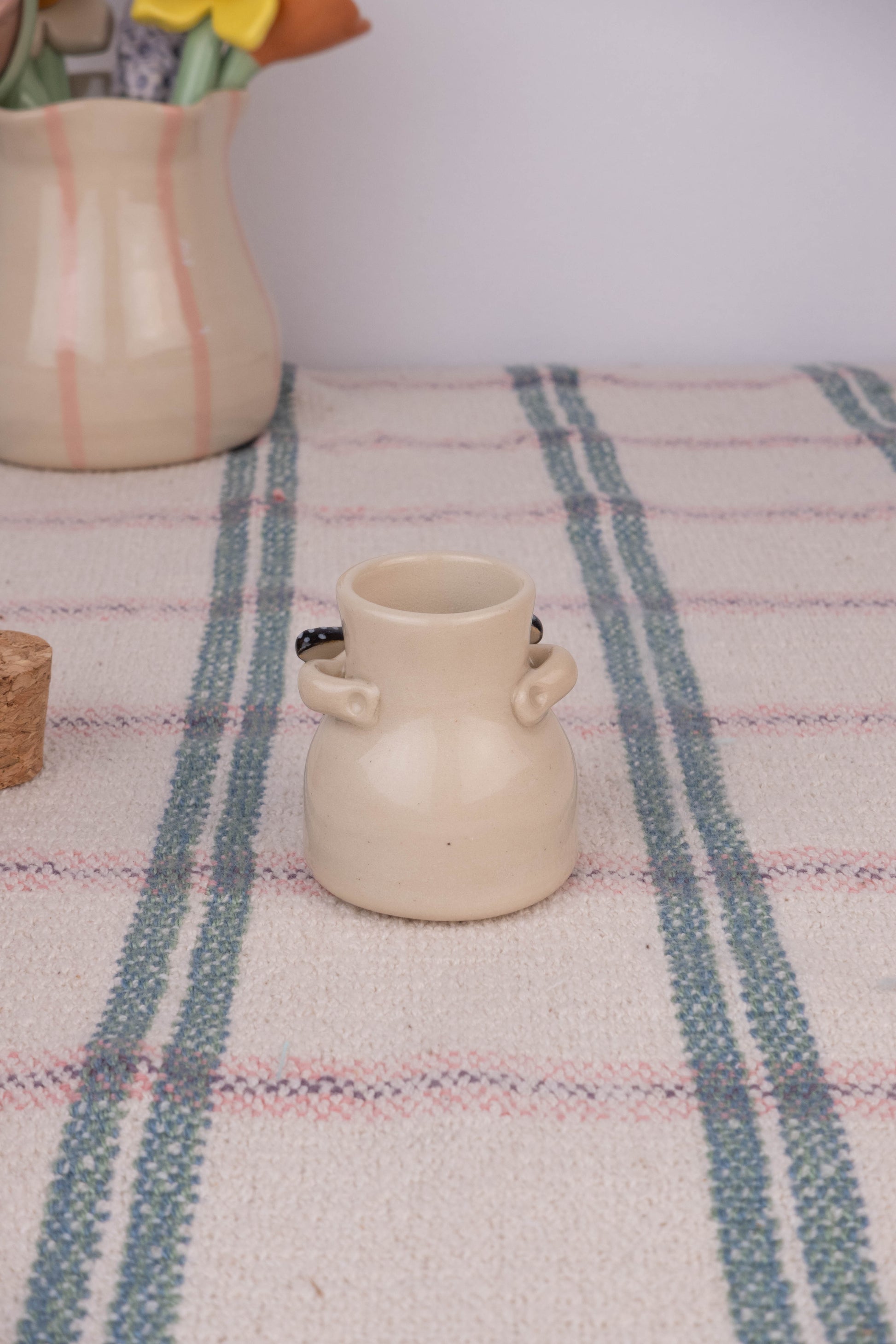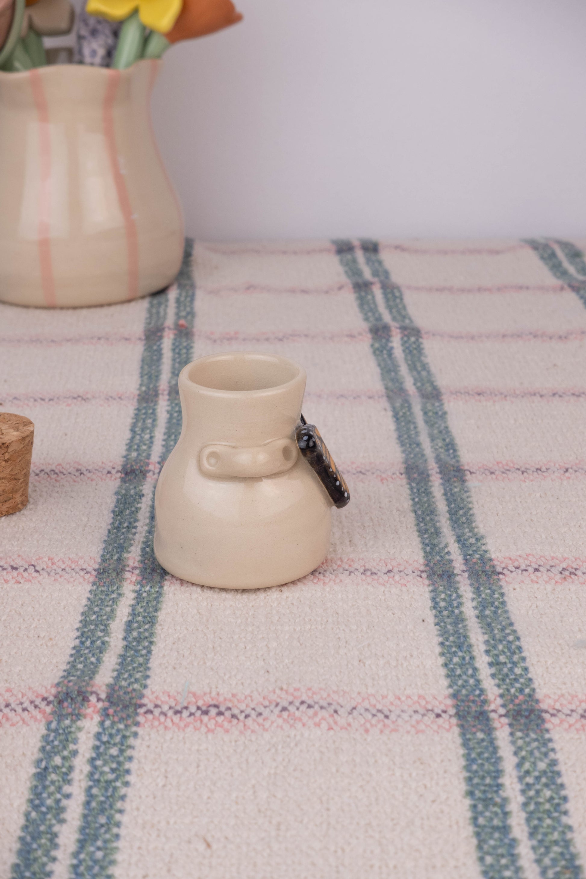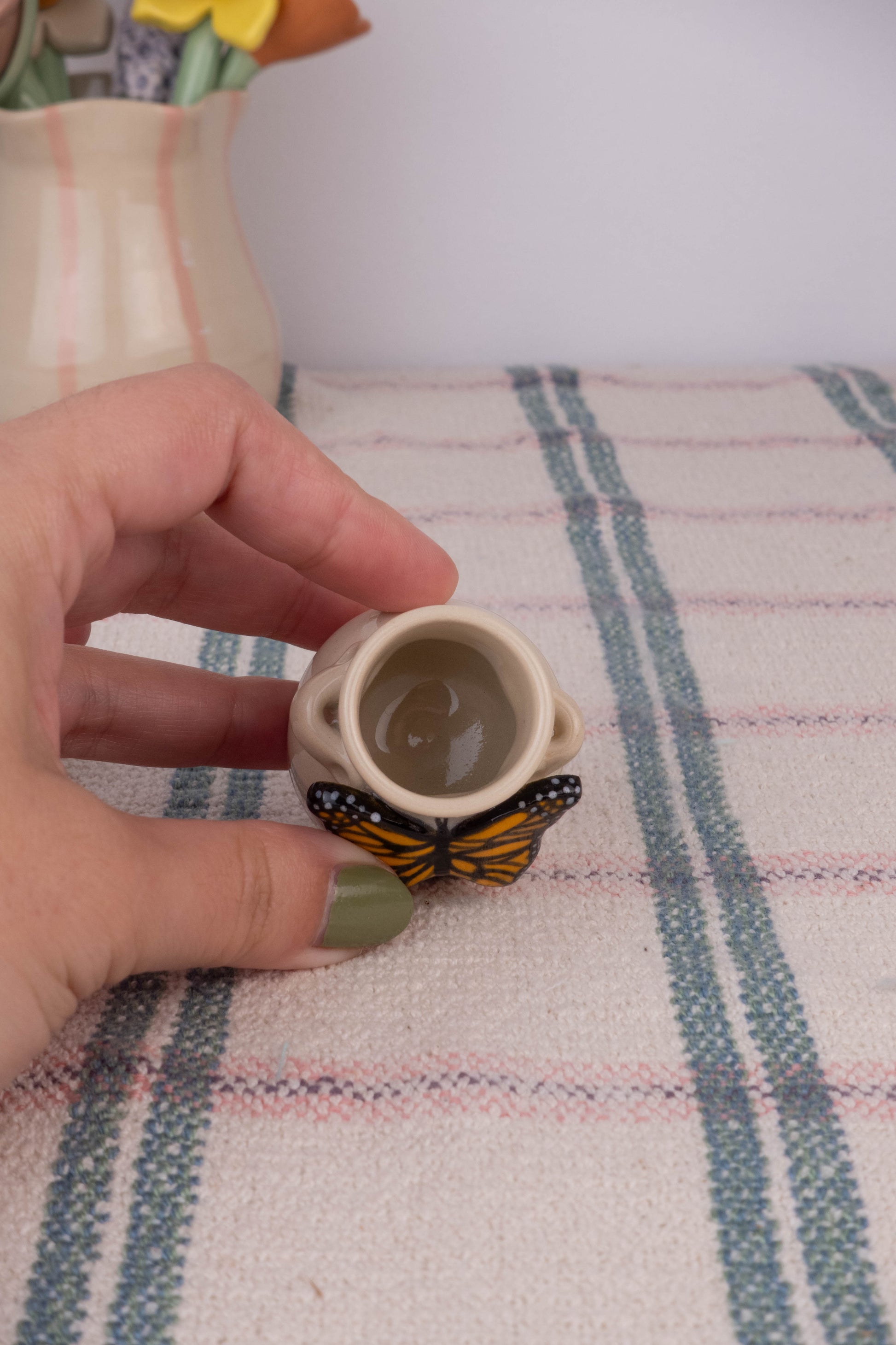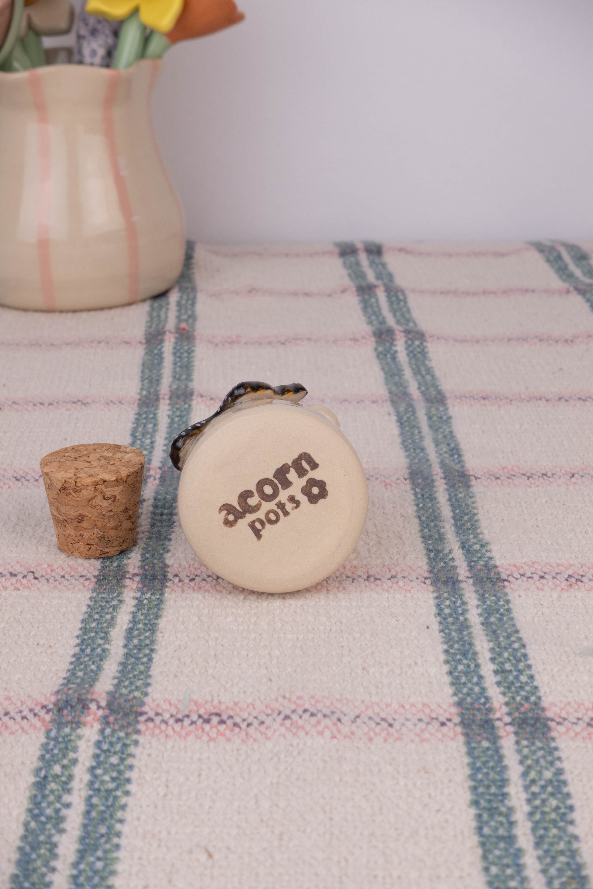 A small bottle that has a monarch butterfly on it with tiny handles! It also has a cork. The bottle is made of a cream coloured stoneware ceramic and glazed with various colours and clear.