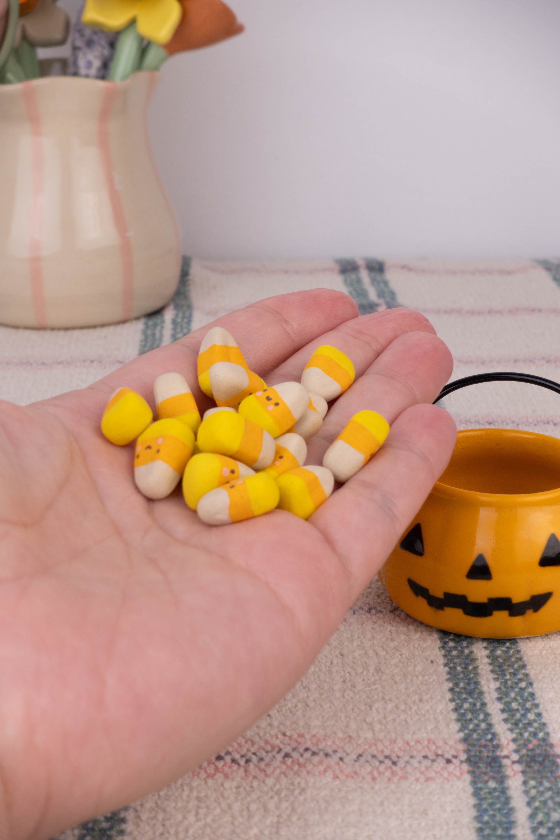 This listing is for one small pumpkin/jack-o-lantern shaped basket with a wire handle as well as approximately 15 candy corn pieces! The basket is made of stoneware ceramic (glazed with various colours and glossy clear) and thrown on the potters wheel, the wire is made of coated aluminum. The candy corn is also made of stoneware ceramic and has a matte texture.