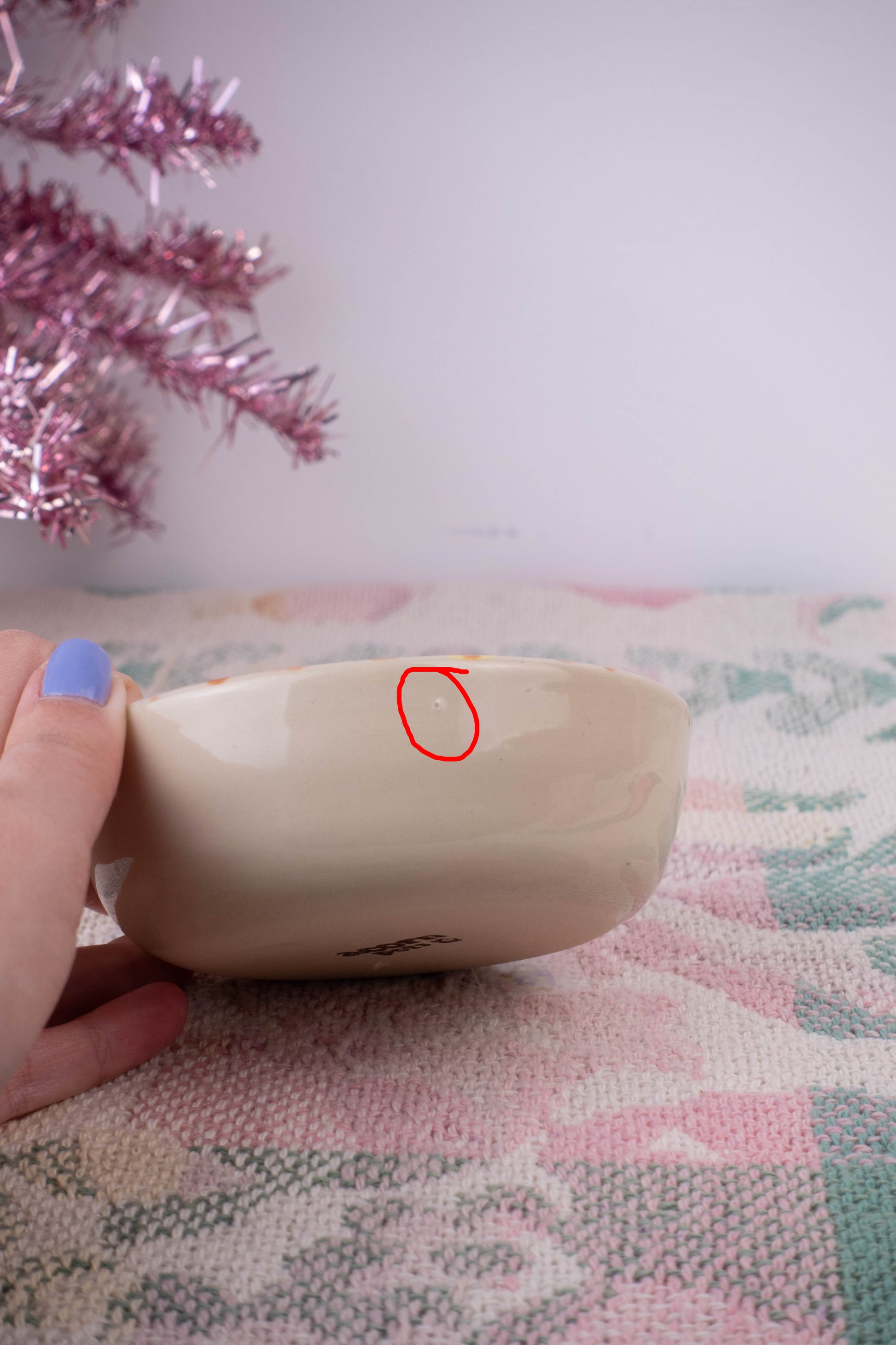 Please note this item is a second because it has large large pinhole on the outside of the bowl, and some smaller ones. (see photo)