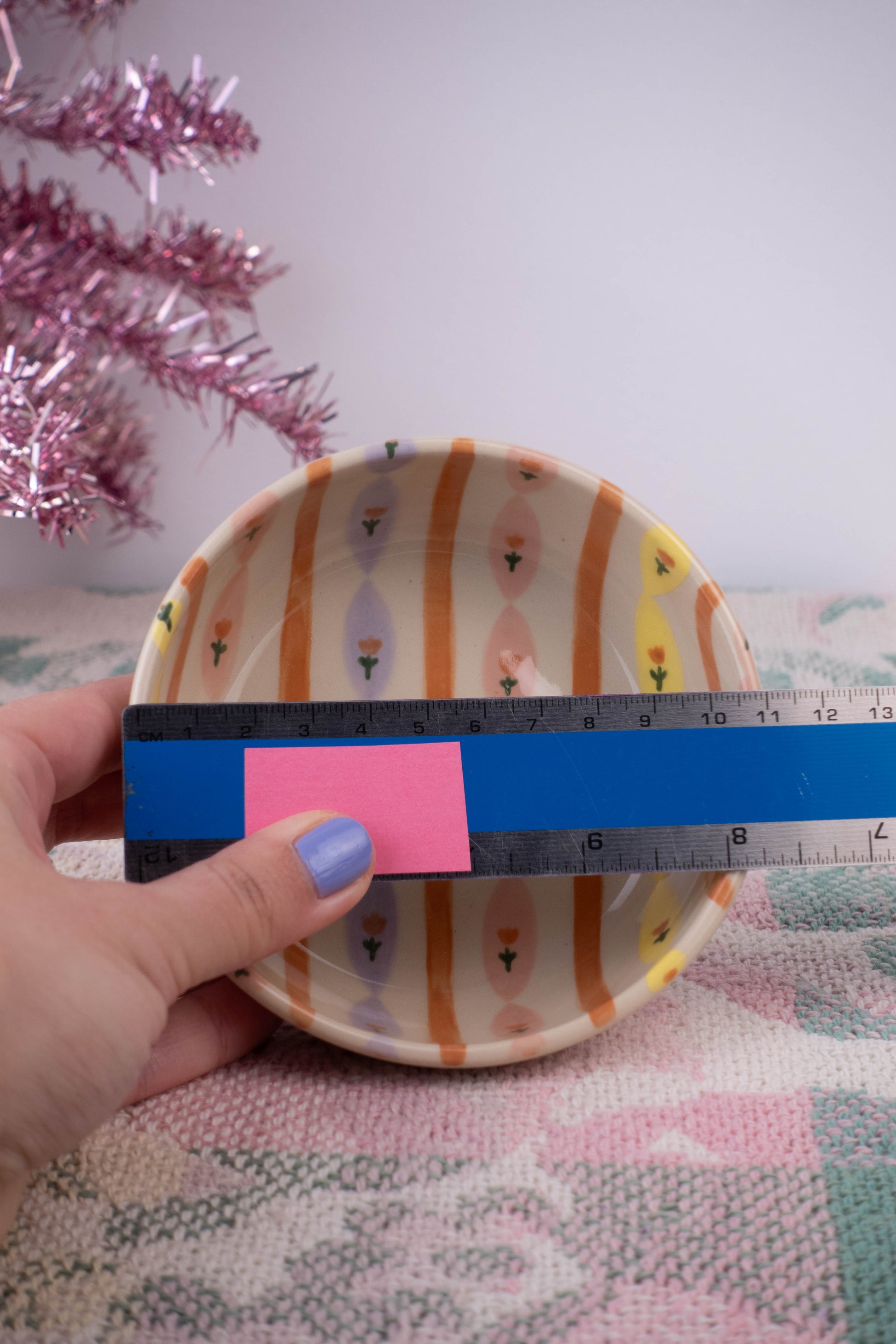 a small dish! made of a cream coloured stoneware ceramic and glazed with a wallpaper design in various colours. This item is thrown on the potters wheel.