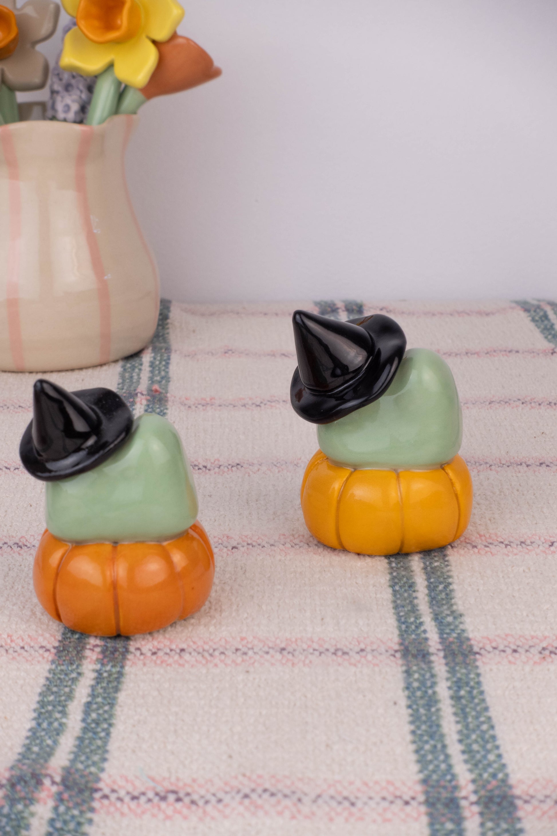 This is a mini frog with a little witch hat sitting atop a jack-o-lantern!