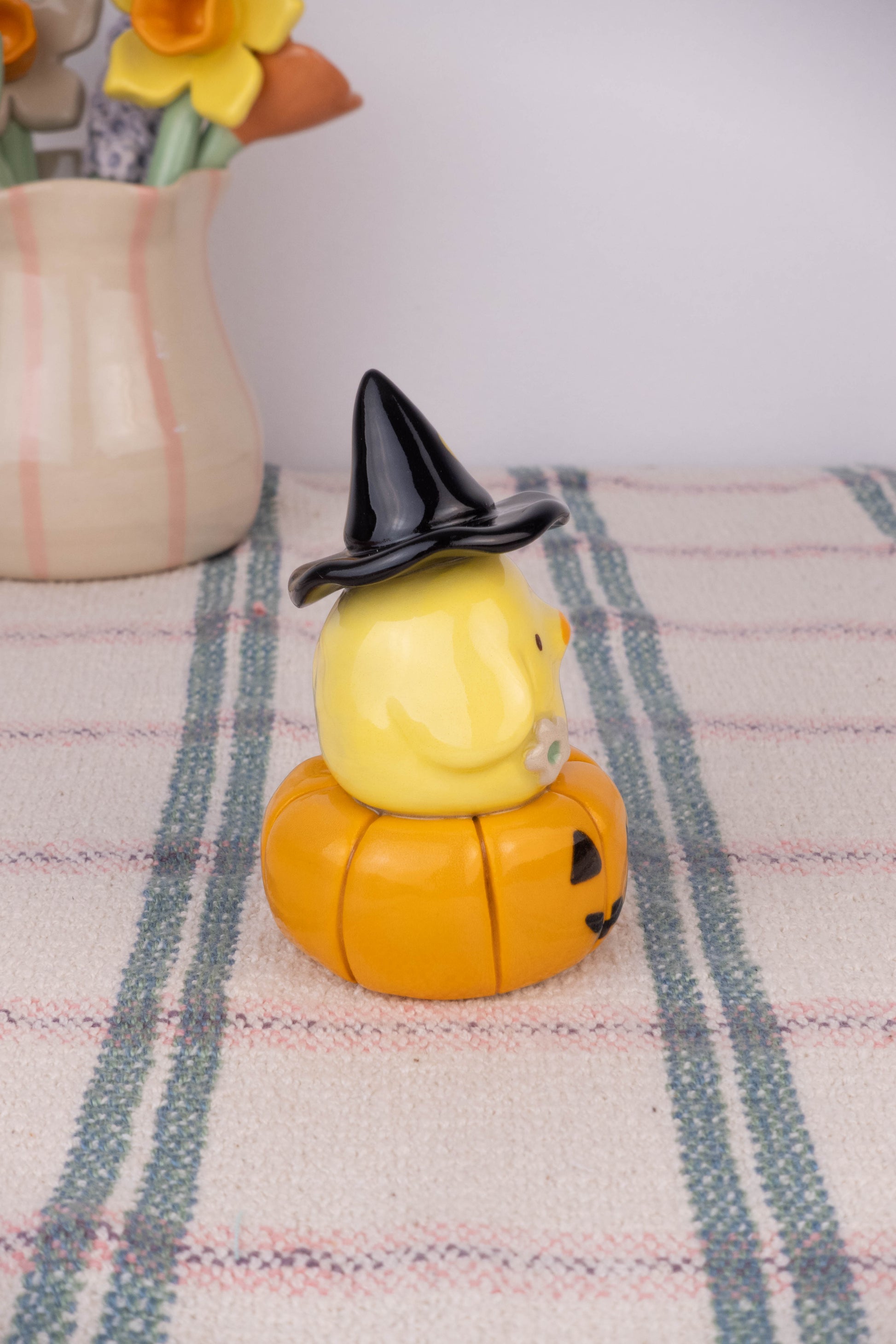 This listing is for 1 mini duck! the duck is wearing a witch hat on a pumpkin!